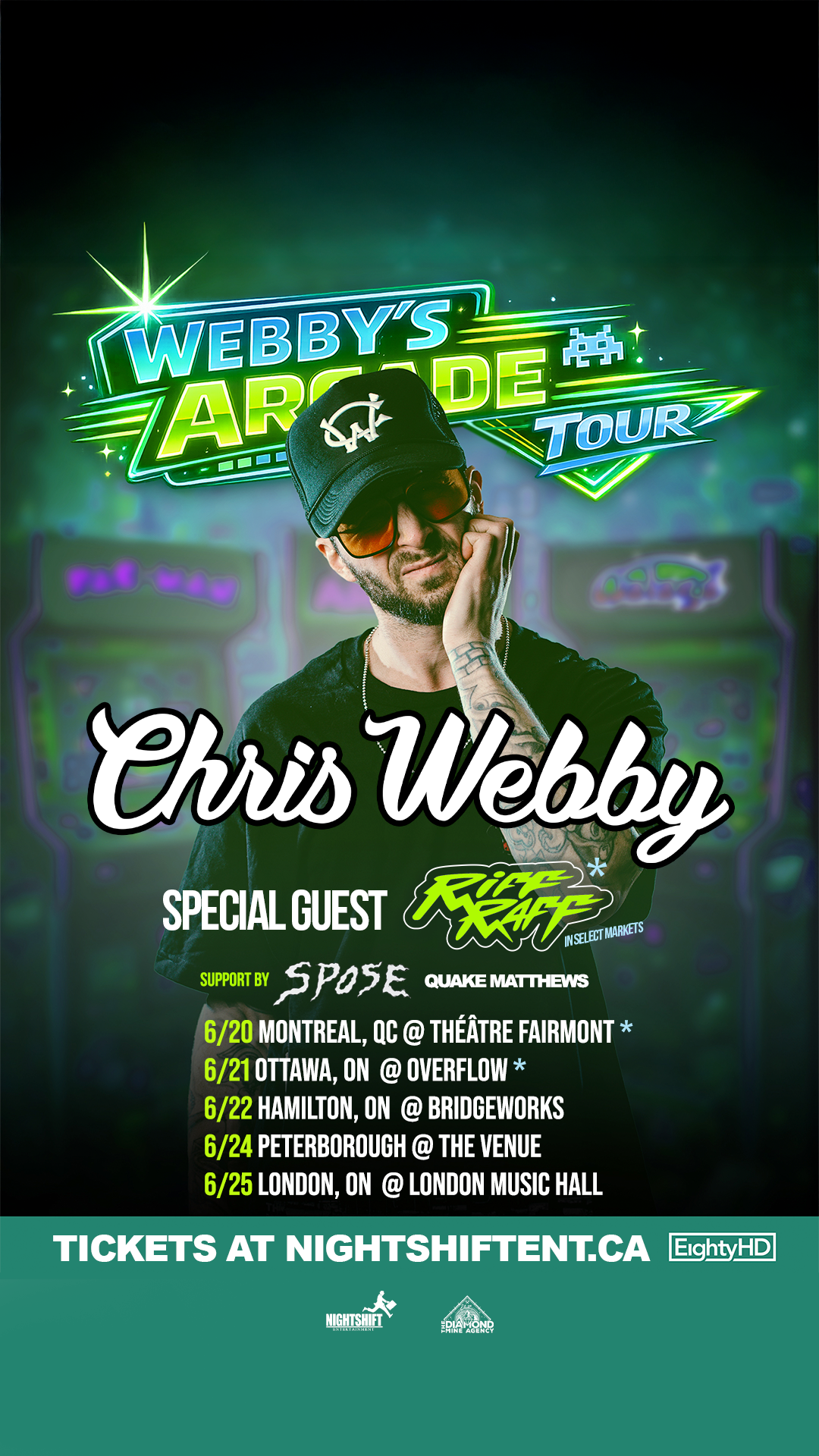 Chris WebbyArtist Chris Webby Canadian Tour Start Date: June 20, 2026, End Date: June 25, 2026Diamond Mine AgencyQUEBECMONTREALWITH RIFF RAFFJUNE 20:THÉÂTRE FAIRMOUNTTicketsDirectionsONTARIOOTTAWAWITH RIFF RAFFJUNE 21:OVERFLOW BREWERYTicketsDirectionsHAMILTONJUNE 22:BRIDGEWORKSTicketsDirectionsPETERBOROUGHJUNE 24:THE VENUETicketsDirectionsLONDONJUNE 25:LONDON MUSIC HALLTicketsDirectionsFEATURED TOUR VIDEO Back To DMA PrevNext